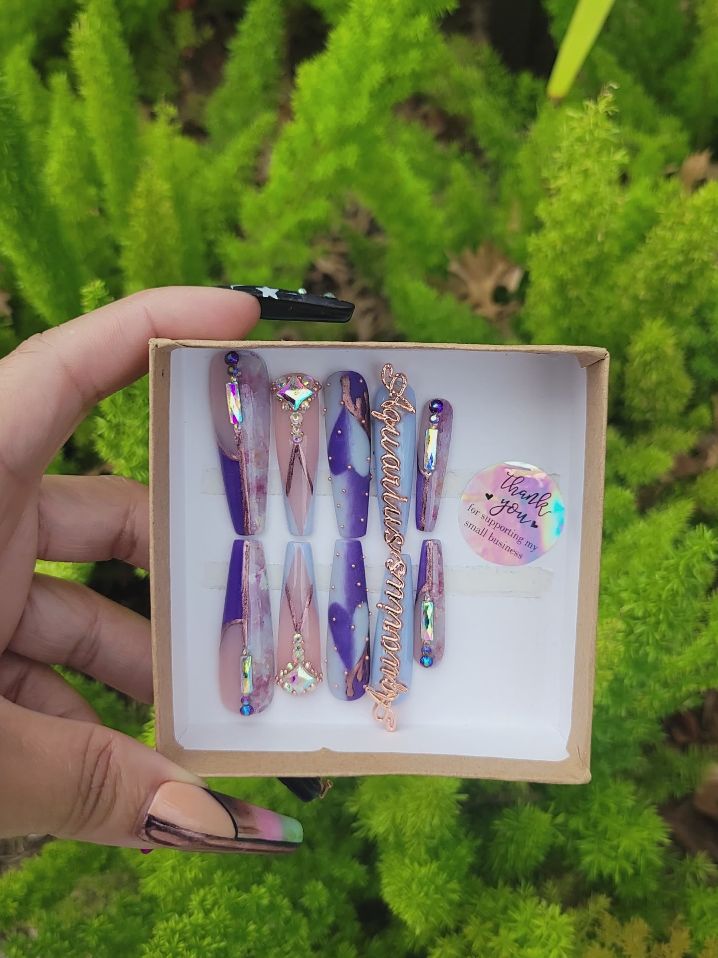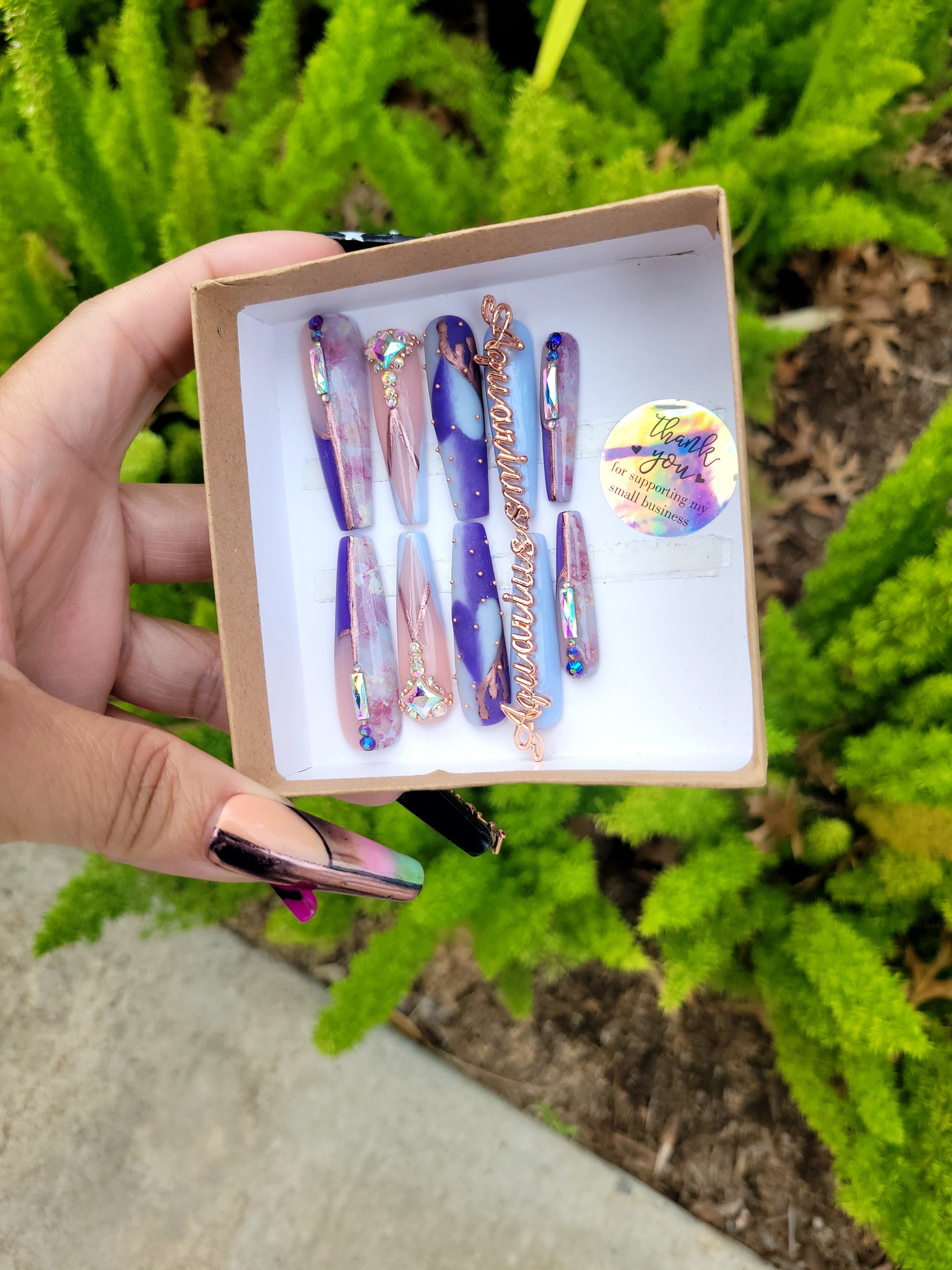 Aquarius Light Blue and Purple Gel Glue On Press On Custom Nail Set